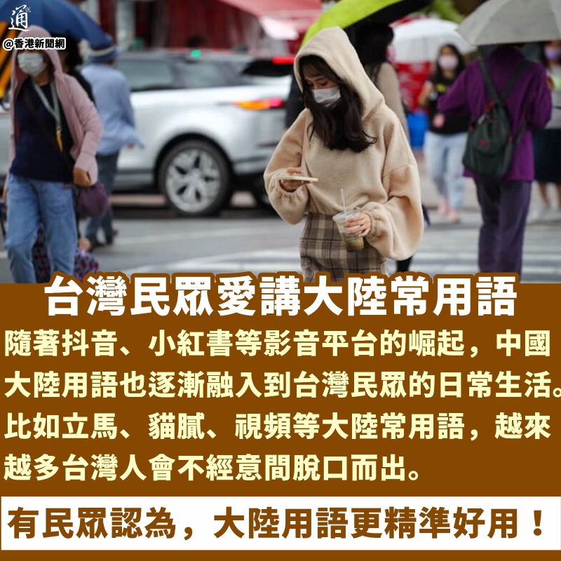 香港新聞網5月7日電 隨著抖音、小紅書等影音平台的崛起,中國大陸用語也逐漸融入到台灣民眾的日常生活。比如立馬、貓膩、視頻等大陸常用語,越來越多台灣人會不經意間脫口而出,有民眾認為,大陸用語更精準好用! 一名台灣網友在論壇發文表示,近期發現許多人開始頻繁使用估計、貓膩、視頻等大陸常用語。其他網友則跟帖指出,諸如老鐵、走心、接地氣、小姐姐、家人們誰懂啊、草率了、我太難了等更網絡化的大陸用語,在台灣也不乏人使用。 有台灣民眾對此表示,大陸用語表達更貼切,“更精準為什麼不用”,而且兩岸同宗同源,不少台灣常用語如“黃牛”“失業”“瓶頸”等,大陸人也在用,這樣的互相交流影響“很正常”。
