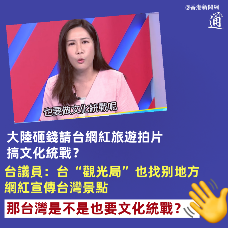 (香港新聞網製圖) “那請問一下,台灣找別的國家的網紅(幫台灣宣傳),那我們是不是也要做文化統戰呢?” 柳采葳批評,這一連串的操作手法只是凸顯了民進黨的不自信。 她又質疑,民進黨之前一直唱衰大陸經濟、說大陸經濟不好,在這套邏輯下,台當局不是更應該讓網紅去拍拍看,大陸經濟有多不好。此外,若大陸經濟若真如民進黨所言那麼差,怎麼還有錢來找網紅拍片呢?(完) 【編輯:刘春】
