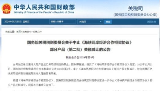香港中通社6月25日電 台北消息:大陸方面6月15日起中止《海峽兩岸經濟合作框架協議》(ECFA)項下134個產品關稅減讓。台灣機械工業公會判斷,機械設備年出口額將因此減少上億美元,在大陸市場佔有率下滑4%至5%。 中國國務院關稅稅則委員會5月31日發布公告,決定自6月15日起,對原產於台灣地區的134個稅目進口產品,中止適用ECFA協定稅率,按現行有關規定執行。 根據公告,本次中止適用ECFA協定稅率的台灣進口產品包括潤滑油、紡織物、機械及零件、汽車零配件等,涉及石化、紡織、機械等產業。