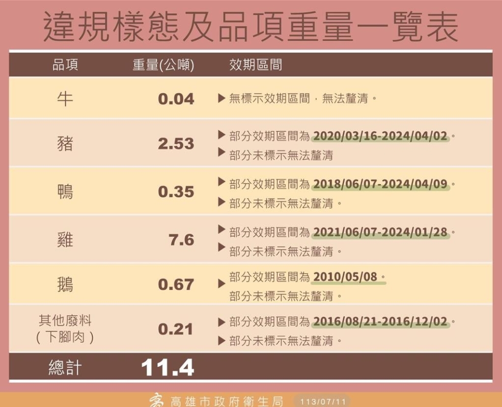 被查扣的冷凍肉。台灣高雄市衛生局圖片 調查結果顯示,被查封的肉品中,有部分過期14年依舊在售賣,也有不少過期肉疑似已經被消費者吃下肚,消息一出,台灣輿論嘩然。 綜合台媒報道,位於高雄市仁武區的柏昇冷凍食品公司,是高雄市多家星級飯店的供應商,日常供應包括雞肉、鴨肉、鵝肉、豬肉、牛肉等肉品,至今已經經營了37年。 不過,日前該公司遭到舉報,稱其違法出售過期凍肉。高雄市衛生局接到舉報後立即將案件移交給地檢署,當地地檢署7月9日即前往搜查,當場查扣了11.4噸的過期肉品,并將公司負責人謝姓夫妻帶走調查。 經檢方調查,該公司向上游商家購買冷藏肉品,若過期未曾售出則冷凍保存起來,修改保質時間或者混合新鮮肉售賣,以此賺取差價。 對此,嫌疑人坦言處理上確實有瑕疵,但否認改標售賣。不過據媒體報道,這些過期肉已經流入了高雄的4家餐廳。 復訊後,謝姓夫妻分別以40萬元、20萬元新台幣交保候傳。而已經流入餐廳的過期肉,檢方稱也已全數預防性下架,其餘具體事宜仍在偵辦中。 據台媒報道,高雄市衛生局7月11日晚發佈消息稱,被查扣的肉品中,有牛肉0.04噸、豬肉2.53噸、鴨肉0.35噸、雞肉7.6噸、鵝肉0.67噸、其他廢料0.21噸,合計11.4噸。其中,有部分肉品未貼標籤,無法厘清具體的過期時間,但其餘能確定時間的肉品中,有部分已過期數年。 值得注意的是,其中鵝肉部分的有效期截止為2010年5月8日,距今已有14年!對此,有台媒痛批這是“僵屍鵝肉”,一旦流入市面進入消費者口中,後果不堪設想。