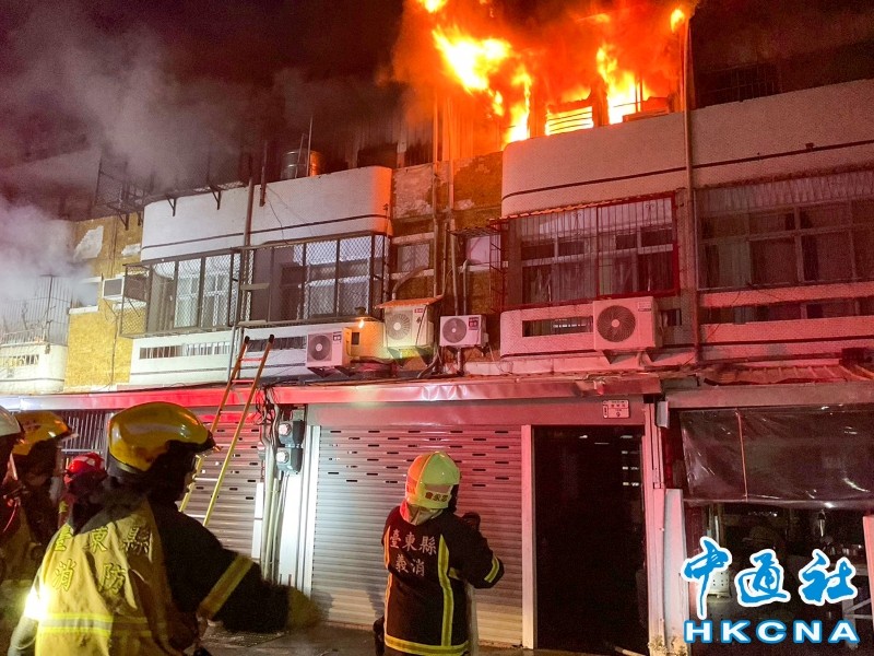 香港中通社圖片 據了解,台東市豐榮路這處3層樓民宅,16日凌晨1樓車庫突竄出火舌,陣陣黑煙竄出天際,火勢迅速蔓延至兩側,鄰近5戶的3樓鐵皮加蓋全都陷入火海,一整排共6間住宅全遭殃。消防出動共19輛消防車及40名消防人員前往救援,當天凌晨5時19分順利將大火撲滅。 消防局表示,共計出動5個消防分隊及安檢隊19車41名消防人員、34 名義消至現場救援。 消防局說明,消防員清理火場時,發現倒臥在隔壁棟後方水塔的黃男,消防員協助脫困,但黃男嘴唇發白,身體十分虛弱,隨即送往醫搶救,初步推測黃男應是被大火所逼才爬到樓頂,跑到水塔躲藏逃命,詳細起火原因及財損情況,仍待警方與消防單位進一步調查。(完) 【編輯:馬華】
