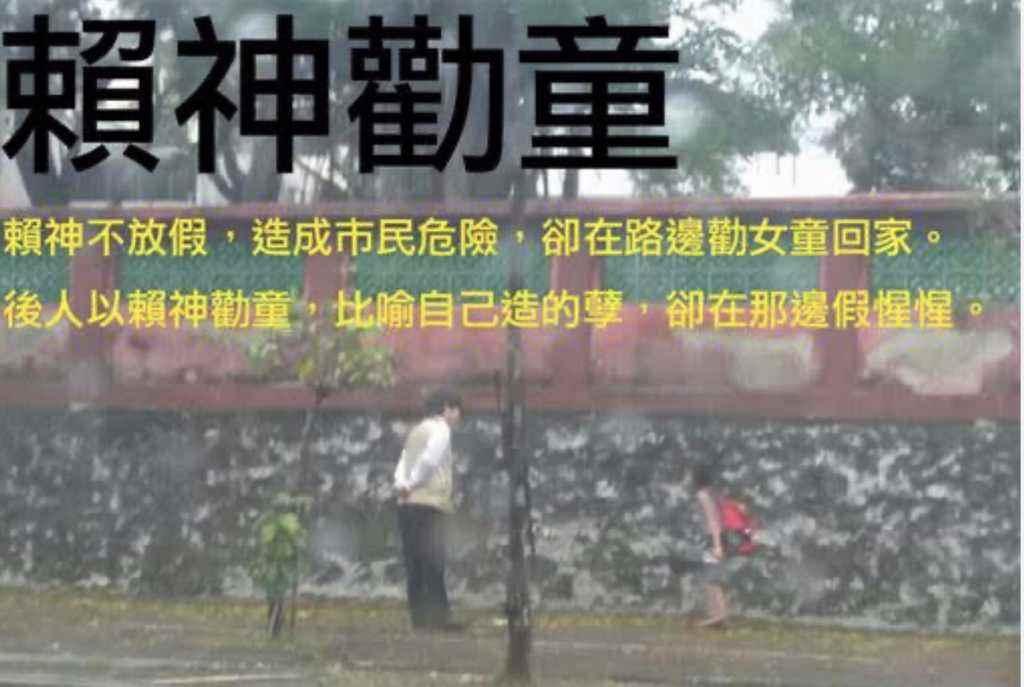 (圖源:葉元之社交媒體) 葉元之表示,賴清德2012年時任台南市長,曾因沒放颱風假先惹議,結果反因颱風襲台當天台南晴空萬里,顯示沒放假是對的,被網友封為“賴神”。 不過,到了2016年的颱風天,賴清德又堅持不放假,這次台南市卻是風大雨大,台南市政府當天早上緊急宣佈放假。賴清德在下令放假後,台南市學生陸續由家長接送回家,此時網絡上剛好出現一張賴清德站在路邊,疑似在和一名女童說話的照片,引發討論,此即為“賴神勸童”的戲稱。 葉元之強調,談起颱風天作秀,沒人能超越當年的“賴神”。(完) 【編輯:张丽欣】