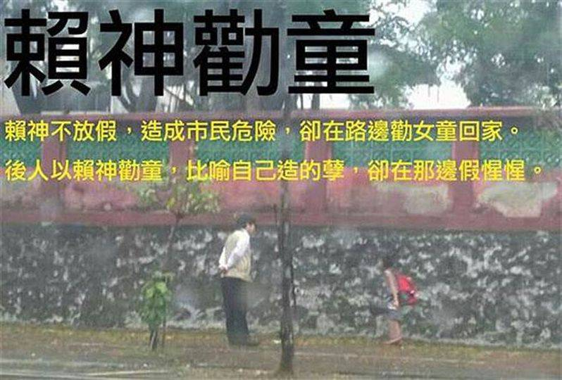 賴清德當年放半天颱風假,網絡上隨即出現“賴神勸童”的新成語,並被網友製圖嘲諷。 顯然,是否放颱風假,對縣市長的壓力真的很大,需仔細考量、評估後再作決定。放得好,瞬間被“封神”,放不好,直接被“罵死”。不過,從過去幾次的颱風可看出,各地方政府大抵都有一個默契,就是“寧可錯放,也不要不放”。因為就算放假當天沒有風雨,但至少有假放,民眾不會太不滿。但切記,“放半天”或等民眾已經出門後,才決定放假,絕對不是一個好的選擇。(完) 【編輯:施鑫岳】