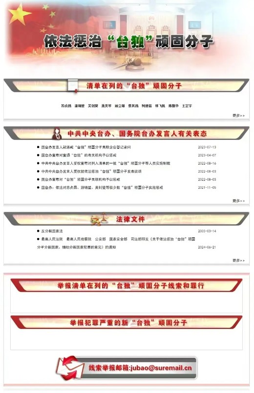 香港中通社8月8日電 關於“依法懲治‘台獨’頑固分子”專欄,中國國務院台灣事務辦公室發言人朱鳳蓮8日表示,清除破壞兩岸關係的害群之馬,目的是從根本上維護台海和平穩定、保障廣大台灣同胞安全福祉。 國台辦、公安部政府網站同步推出“依法懲治‘台獨’頑固分子”專欄,公佈針對“台獨”頑固分子的線索舉報郵箱,引發關注。民進黨當局對此歪曲抹黑,稱大陸相關舉措對兩岸交流互動製造更多的障礙與傷害、阻撓兩岸人民往來交流,對促進兩岸良性交流沒有任何好處;并稱大陸沒有權力“懲治台灣人民”。 對此,朱鳳蓮表示,台灣是中國的一部分,絕不允許“台獨”分裂勢力以任何名義、任何方式把台灣從中國分裂出去。依法懲治“台獨”頑固分子分裂國家、煽動分裂國家犯罪,是捍衛國家主權、統一和領土完整的應有之義,是維護兩岸同胞共同利益和中華民族根本利益的正義之舉。兩岸民眾高度支持有關依法懲“獨”措施,認為精准打擊“台獨”頑固分子的措施行之有效,也充分認識到依法懲治的是極少數涉“獨”言行惡劣、謀“獨”活動猖獗的頑固分子及其實施的分裂國家、煽動分裂國家犯罪,不涉及廣大台灣同胞。
