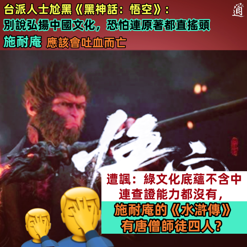 香港新聞網8月26日電 台派人士尬黑大陸遊戲《黑神話:悟空》,結果鬧了個大笑話! 中國大陸首款3A遊戲《黑神話:悟空》20日上午10時正式發售,不到2小時,在Steam平台的線上玩家數量就超過100萬;23日,《黑神話:悟空》官方微博發文稱,截止北京時間8月23日21點整,全平台銷量已超過1000萬套。《黑神話:悟空》的爆火引發現象級討論,風潮亦刮到台灣。然而,部分“逢中必反”的台派人士卻跳腳了,繼早前有人在網絡放言“這麼喜歡就滾出台灣”後,又有親綠臉書粉絲專頁發文酸《黑神話:悟空》 ,結果反暴露自己缺乏常識。 “黑悟空的確是糞作無誤。”一個有5.4萬粉絲的親綠臉書粉絲專頁25日發文“點評”《黑神話:悟空》:“劇本基本上是0分,可以說根本沒完成,整個遊戲的內容調性都有問題。”又聲稱整個遊戲最缺的,就是文化底蘊,“《黑神話:悟空》別說是弘揚中國文化,恐怕連原著都會直搖頭,因為根本是在亂改,施耐庵應該會吐血而亡。”