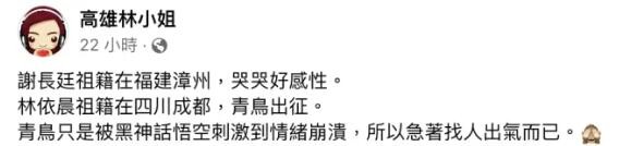 其實,早在十年前就有相關報導。林依晨2013年到四川宣傳電視劇《蘭陵王》時,曾發文談到在爺爺去世後,自己回到成都的感想:“在飛機慢慢下降的過程中,看到這片土地,突然有種強烈的歸屬感,若是爺爺當初沒有來到台灣、沒有選擇奶奶,也就沒有我的爸爸,更不可能遇見媽媽,甚至有我的出生了,很奇妙的因緣”。 然而,林依晨在節目中的自然真情流露,卻刺激到了台灣島內綠媒的神經,有綠媒大打“抗中保台”牌,發文稱“零負評女神也跪了”,企圖挑起台民眾的輿論攻擊。林依晨的維基百科也曾一度遭到惡意攻擊,被改成“林依晨出生於宜蘭縣,但自稱大陸成都人”。 然而大部分台灣網友都是人間清醒,紛紛對林依晨表示力挺,“她爺爺是成都人,她自稱成都人又有何不對”“林依晨贊!做堂堂正正的中國人超酷”“不能說自己祖籍在哪?只要說就會被出征或是惡意攻擊”。 更有台灣網友挖出台當局“駐日代表”謝長廷2012年赴大陸祭祖拭淚的歷史畫面:“謝長廷祖籍在福建漳州,哭哭好感性。”
