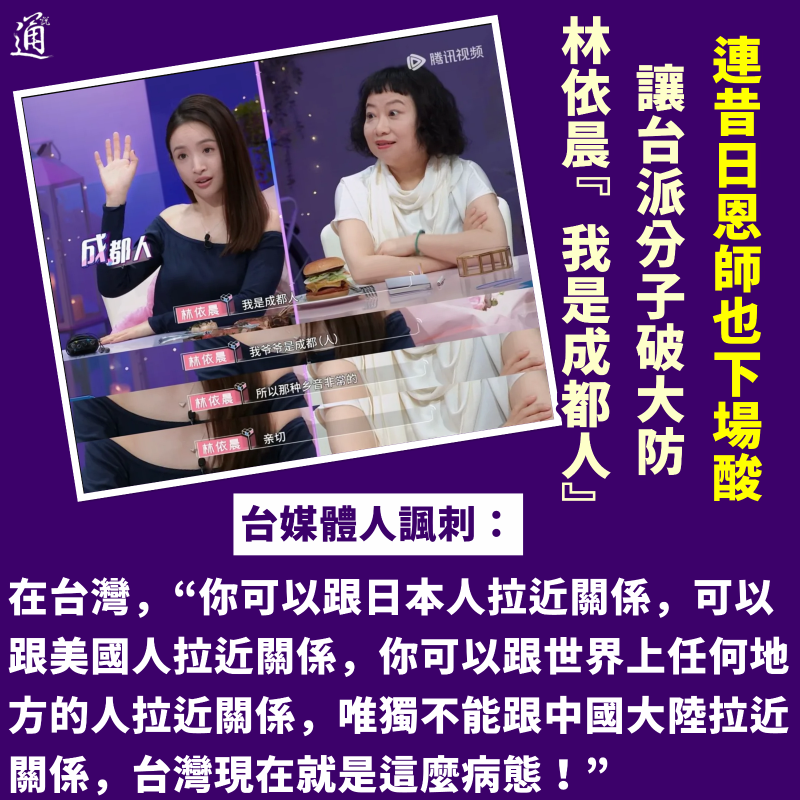香港新聞網9月3日電 林依晨一句“我是成都人”,讓台派分子破大防? 近期,在台灣有著“零負評女神”稱號的演員林依晨參與了大陸一檔戀愛觀察節目的錄製。當節目中的嘉賓聊到自己是哪裡人時,林依晨舉手高喊:“我是成都人”,因為自己的爺爺來自成都。被問到會不會說四川話,林依晨苦笑說“不會”,但以前常聽爺爺說,所以對鄉音倍感親切。 節目播出後,許多大陸網友感到驚訝,紛紛表示:“第一次知道她祖籍成都”,“原來姐姐是成都妹呀”,“終於找到林依晨姐姐漂亮的原因了!” 然而,一群台派分子卻“反中”反到失智,不僅揚言“零差評女神大翻車”,紛紛出征林依晨的社媒賬號,還擅自篡改林依晨的維基百科,在早年及教育那欄補進“林依晨出生於宜蘭縣,但自稱中國成都人”。 就連她的大學老師2日也酸言酸語稱不記得教過“成都人”,還說教師節別再傳祝福信息了,但不知是否有關言論遭到不少台灣網友批評,相關貼文疑似已刪除。