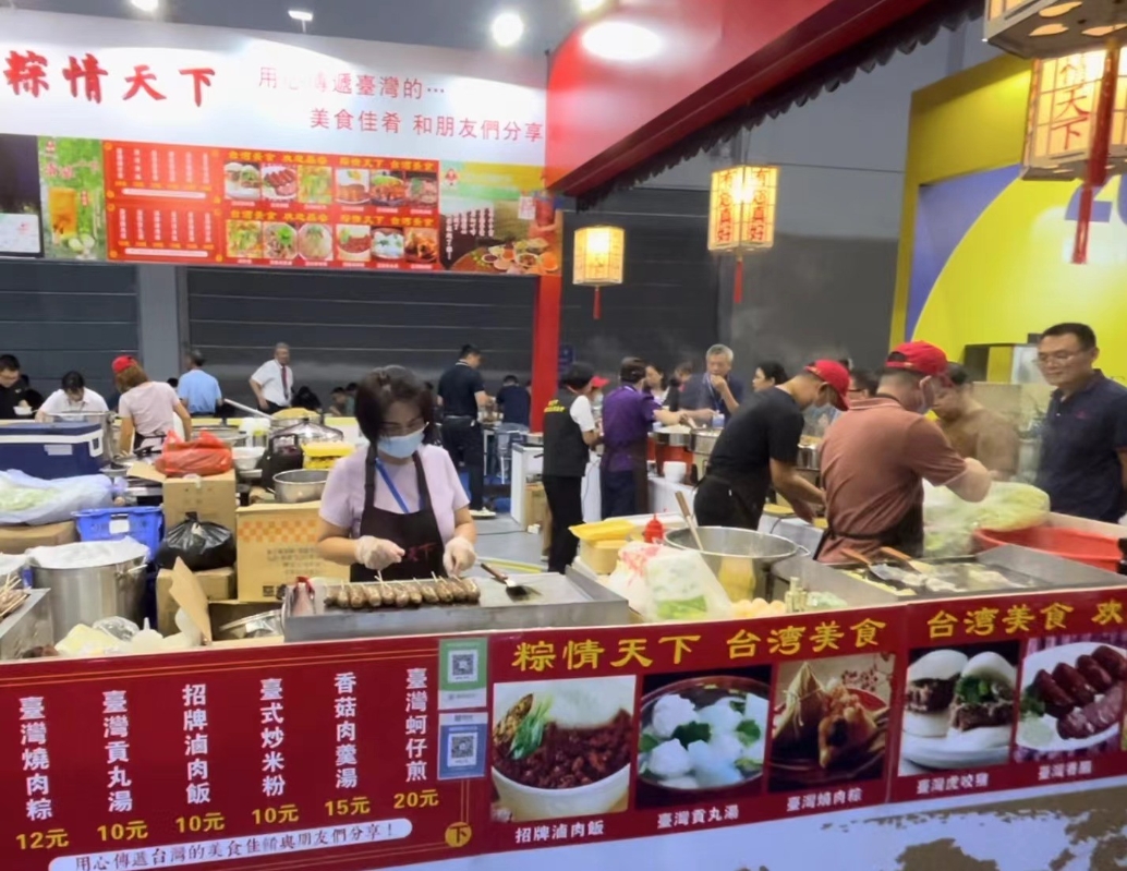 香港中通社記者 鄭竣凱攝 進入會場,參展民眾可以體驗“台灣一日遊”。除去遊覽省市形象館外,伴手禮區能讓民眾全方位體驗台灣名產,不只有鳳梨酥、高山茶、高粱酒等傳統特產,也包括特色零食、玩具、外用膏藥、運動用品等等。 逛累之後,參展民眾還可以前往美食區,享用來自台灣的特色美食。既可以選擇滷肉飯、大排飯等台式便當,也可以嘗試蚵仔煎、大腸包小腸、魷魚肉羹等小吃,還有台式奶茶、果汁以供解渴。