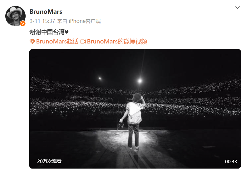 香港新聞網9月13日電 美國流行歌手火星哥布魯諾(Bruno Mars)近日在台灣高雄舉辦演唱會,事後,布魯諾在社交平台Instagram上曬出一段演唱會現場影片,並寫道“Thank You Taiwan(謝謝台灣)”,但隨後改為“Thank You Kaohsiung(謝謝高雄)”,同時文末的所謂台灣旗幟亦改為 “愛心”。在內地社交平台微博,布魯諾的賬號亦以簡體字發文:“謝謝中國台灣”。