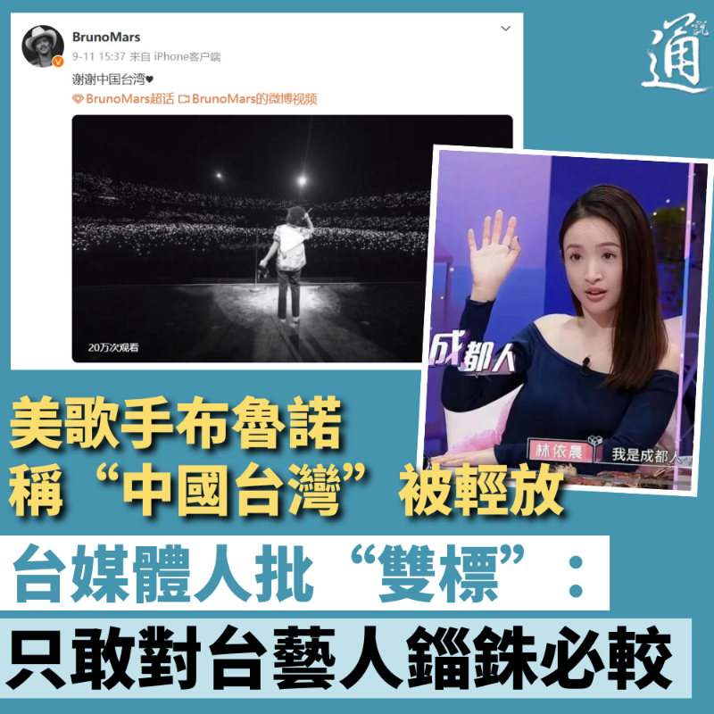 (微博截圖) 布魯諾此舉令台派分子集體破防。在其帖文和相關新聞的評論區,他們聲稱“失望”“真心換絕情”,又說台灣這次是“提供免費場地給人家賺錢,結果一回頭被搧一巴掌”;還有網友酸稱,沒想到像布魯諾這樣的巨星也得看大陸臉色。 事件引發熱議後,高雄市政府12日發文回應稱,“高雄演唱會有來自世界各地的歌迷朋友,“大家都是地球人,謝謝火星人給大家一個美好夜晚。” 一番有些“輕描淡寫”的回應難免讓人聯想到,此前對於不少公開說自己是中國人的台灣藝人,台派完全是另一副嘴臉! 近期,台灣演員林依晨在大陸的一檔綜藝節目中和嘉賓聊到自己是哪裡人時,舉手高喊“我是成都人”,因為自己的爺爺來自成都。節目播出後,林依晨的社媒賬號慘遭台派分子“出征”,被形容“零差評女神大翻車”;林依晨的維基百科詞條亦被擅自篡改,早年及教育那欄被補進“林依晨出生於宜蘭縣,但自稱中國成都人”。