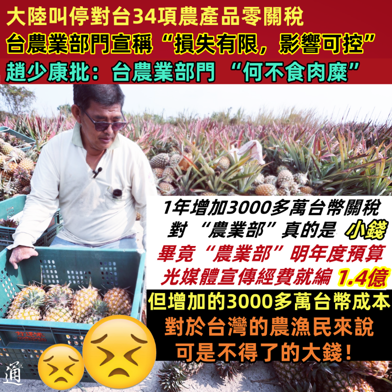台農業部門對大陸政策的回應,遭批“何不食肉糜”!香港新聞網9月19日電 中國大陸宣布對34項台灣農產品停止執行進口零關稅政策。對此,台農業部門祭出輕飄飄地8個字——“損失有限,影響可控”,台灣媒體人趙少康今日(19日)發文批評,台農業部門有關回應簡直“何不食肉糜”,“‘農業部’一句損失有限,在農漁民的傷口灑鹽”。 大陸叫停對台34項農產品零關稅後,台農業事務主管部門負責人陳駿季表示,初步評估對鳳梨、釋迦、與剛恢復可以輸入大陸的柚子以及白帶魚影響較大。以2023年的資料來看,這34項農產品初估年關稅成本為107.5萬美元(約3434萬元新台幣)。認為雖有影響但衝擊不大,風險可控管。 “一年增加3000多萬台幣的關稅,對‘農業部’來說真的是小錢,畢竟‘農業部’明年度預算, 光是媒體宣傳經費就編了1.4億元(新台幣,下同)。”趙少康今日(19日)在社交平台臉書發文直指,但是增加的3000多萬台幣成本,對於台灣的農漁民來說可是不得了的大錢。 趙少康表示,農業的經濟產值低,的確不能跟工業產品相比,但農業問題不只是農業、經濟問題,更是政治問題。因為農業的從業人口很多,關稅增加就會打擊台灣農漁民的生計。