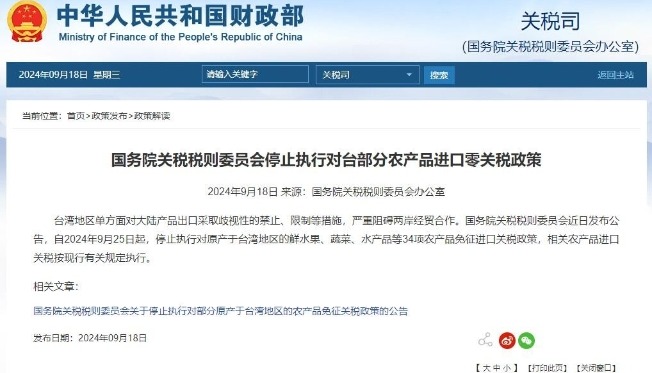 (香港新聞網製圖) 台灣網友也在趙少康相關文章的評論區留言自嘲:“沒事,最後一定拿辛苦納稅錢來補貼!”還有網友感歎,大陸“不讓利,台灣農產品競爭力真的不大。” 據中國財政部18日在官網發布的消息,台灣地區單方面對大陸產品出口採取歧視性的禁止、限制等措施,嚴重阻礙兩岸經貿合作。中國國務院關稅稅則委員會近日發布公告,自2024年9月25日起,停止執行對原產於台灣地區的鮮水果、蔬菜、水產品等34項農產品免征進口關稅政策,相關農產品進口關稅按現行有關規定執行。 中國國務院台辦發言人陳斌華18日表示,大陸方面秉持“兩岸一家親”理念,於2005年8月1日和2007年3月20日起,分兩批對原產於台灣地區的鮮水果、蔬菜、水產品等34項農產品免征進口關稅,有力幫助台灣農產品開拓大陸市場,台灣農漁民從中獲得實實在在的好處。 陳斌華表示,但賴清德當局上台以來,頑固堅持“台獨”立場,不斷進行謀“獨”挑釁,升高兩岸敵意對抗,阻礙兩岸交流合作,至今仍單方面限制大陸1000多項農產品輸入,嚴重損害兩岸同胞福祉。鑒此,國務院關稅稅則委員會近日發布公告,決定自2024年9月25日起停止執行對台34項農產品免征進口關稅政策,我們對此表示強烈支持。(完) 【編輯:劉春】