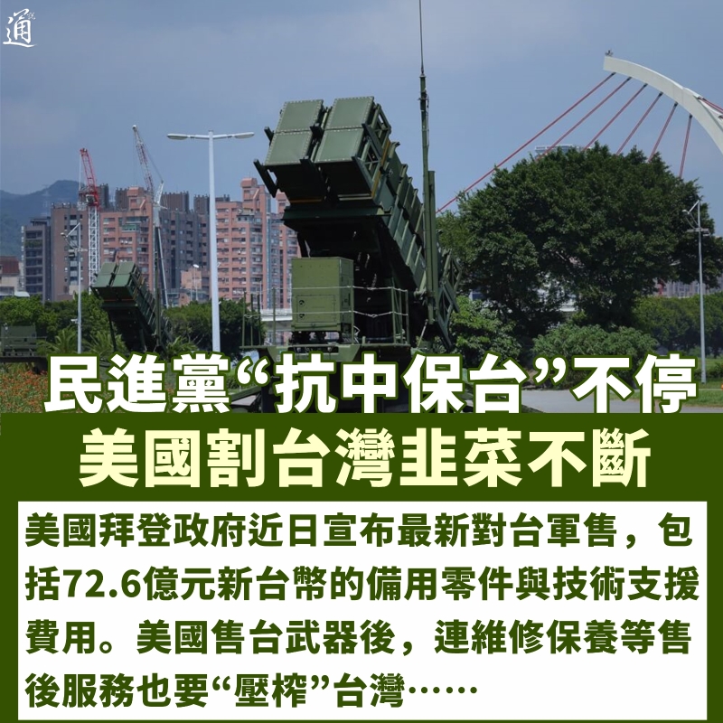 香港新聞網9月20日電 美國拜登政府近日宣布最新對台軍售,包括72.6億元新台幣(約2.28億美元)的備用零件與技術支援費用。美國售台武器後,連維修保養等售後服務也要“壓榨”台灣,有台媒體人認為,只要民進黨 “抗中保台”不停,台灣就會不斷被美國割韭菜! 據台媒報道,美國國防安全合作署(DSCA)近日宣布最新對台軍售,美國務院批准售台戰機所需的備用零件與技術支援,金額約合新台幣72.6億元。這是美方今年第5次,也是拜登政府第16次對台軍售。 台資深媒體人柳傑克在《今晚聊點有用的》節目中談及此事時表示,這就是美國“精明”之處,他們出售武器不是一次性的,還包括後續一系列的設備保養與零件替換等服務費,“賣你一台武器,他後面賺你一輩子的錢!” “我們如果每一天都是採取 ‘抗中保台’的策略,我們就會一直被美國割軍火的韭菜,”柳傑克分析說,美國之所以樂於在全世界製造爭端,就是因為“大炮一響,黃金萬兩”,美國軍火商可以藉此大發戰爭財。
