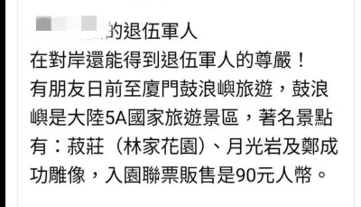 台時事評論員王尚智在該節目中以湖南張家界為例,稱“入口門票就1000多台幣,張家界要好好玩,可能門票費超過3000到5000台幣。”認為有關政策能幫台灣民眾節省不少費用。 台軍退將栗正傑則在一旁補充,其實除了此次的惠台政策,台灣退伍軍人去大陸也能享受優惠,包括可以半價購買大陸景點的門票,“它(大陸)視同我們是退伍軍人。”同時,台退伍軍人也能使用大陸“軍人優先”的服務窗口。 “我是沒有去過,可是我們有退伍弟兄有一次去試,真的給他半票,而且他去排隊的時候可以(使用)優先窗口。” 念及此,栗正傑忍不住感慨:“人家對岸對我們台灣軍人是這個樣,那我們台灣自己對軍人是什麼樣,早就取消軍警半票。” 他又提到,台當局領導人賴清德近期還被爆料辱罵台灣將官一事,坦言看在眼裡,真的很痛心,“你跟對岸做個比較,人家為什麼願意打仗,我們台灣為什麼不願意打仗,道理就在這邊。” (視頻編輯 香港新聞網) 近日,賴清德出席晉任台軍將官茶會,傳出因台軍將官們沒有起立而當場不悅,以嚴正口氣提醒台軍軍人注意禮節。栗正傑當時在節目上質疑,賴清德把將官們罵一頓,叫他們回去怎麼帶下屬;台前空軍副司令張延廷也指出,台軍將官比例稀少、20年前90個飛行員中,只有9人晉升將領,認為賴清德應勉勵、慰勞這些晉任的將官,而不是對他們發脾氣。 在台灣討論大陸對台 “首來族”免門票的視頻節目下,不少台灣網友均點讚大陸惠台新政。 “太棒了,我還沒辦過(台胞證),趕快辦一辦去玩啦,管他什麼綠政府。”有台灣網友分享稱,“親身體驗,台胞只要滿60歲就可同享大陸敬老待遇‘門票免費’,拿台灣學生證也同享門票半價優惠。” 值得注意的是,也有台灣網友發出靈魂拷問:“大陸有惠台政策,我們政府有惠中(陸)政策嗎?” (完) 【編輯:劉春】