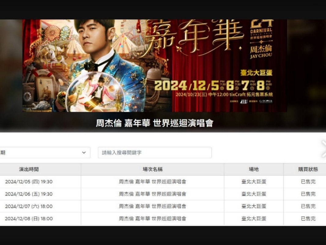 周杰倫4場演唱會門票搶光,下午3時重新釋票。(圖源:拓元售票系統) 演唱會的票價分為六個等級,從1880元(新台幣,下同)到6880元不等。儘管許多歌迷提前練習搶票,甚至有粉絲為了網速衝到網咖備戰,最終仍難以如願。許多粉絲在社交媒體上“哀嚎”,表示看著藍圈圈轉動了許久,卻無法進入結帳頁面。 據台媒報道,今天中午的售票高峰期,最高同時上線人數達到890,583人,5分鐘內便售出近15萬張門票,創下劉德華和張學友的開賣在線人數紀錄。拓元售票系統執行長邱光宗表示,為了應對這一需求,系統使用了歷史上最多的1萬多台虛擬機器和最大的頻寬,未來可能只有周杰倫能超越這一紀錄。演唱會主辦方杰威爾也明言,演唱會不會再加場。 隨著今天的售票完售,拓元售票系統在社交媒體上公布,周杰倫“嘉年華”世界巡迴演唱會的票券已全數售罄,系統將進行對賬,並將於下午3時重新釋票,讓粉絲們再次期待能夠搶到心儀的門票。(完) 【編輯:黃璇】