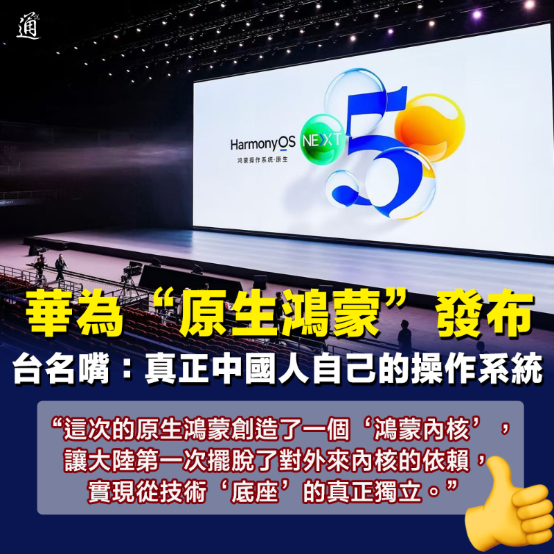 香港新聞網10月24日電 10月22日,中國華為技術有限公司在深圳正式發布原生鴻蒙系統HarmonyOS NEXT,作為中國首個實現全棧自研的操作系統,它的發布標誌着中國在操作系統領域取得突破性進展,打破iOS和android長期以來的壟斷地位,打造了全球第三大移動操作系統。台時評員介文汲認為,這次的原生鴻蒙創造的 “鴻蒙內核”,讓大陸第一次擺脫對外來內核的依賴,實現從技術底座的真正獨立。 全棧自研是指原生鴻蒙操作系統從內核、數據庫到編程語言、AI(人工智能)大模型等全面自研,全面突破操作系統核心技術,真正實現了中國國產操作系統的自主可控。