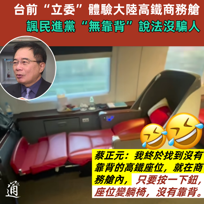 (蔡正元影片截圖) 馬英九去年4月首次訪問大陸,期間搭乘大陸高鐵時,稱讚大陸高鐵寬敞舒適,引發綠營不滿。王義川在一檔親綠節目中宣稱,馬英九被大陸騙了,因為大陸的高鐵座椅上沒有靠背。他還說,馬英九搭高鐵照片中的靠背,以及餐桌上的桌巾、水果、杯子,都是大陸事先準備好一整組放在那的,沒有人會說大陸的高鐵是好的, “不要傻傻的”,在兩岸引發熱議。 台前“立委”蔡正元近日身處大陸,他29日在社交平台臉書曬出開箱大陸高鐵商務艙的影片,提到比台灣高鐵的商務艙座位大不少,“民進黨說大陸高鐵沒有靠背,我找了老半天都找不到沒有靠背的高鐵座位。”他諷刺民進黨應該不會公開說謊,大陸把沒有靠背的座位藏起來,“這應該是某種黑科技”。 其後,他又上傳一條展現大陸高鐵商務艙的座椅可以變躺椅的短片,揶揄民進黨說大陸高鐵沒有靠背是“真的”,“我終於找到沒有靠背的高鐵座位”,就在商務艙內,只要按一下鈕,座位變躺椅,沒有靠背,“民進黨說沒有靠背是真的,民進黨果然不會騙人!”