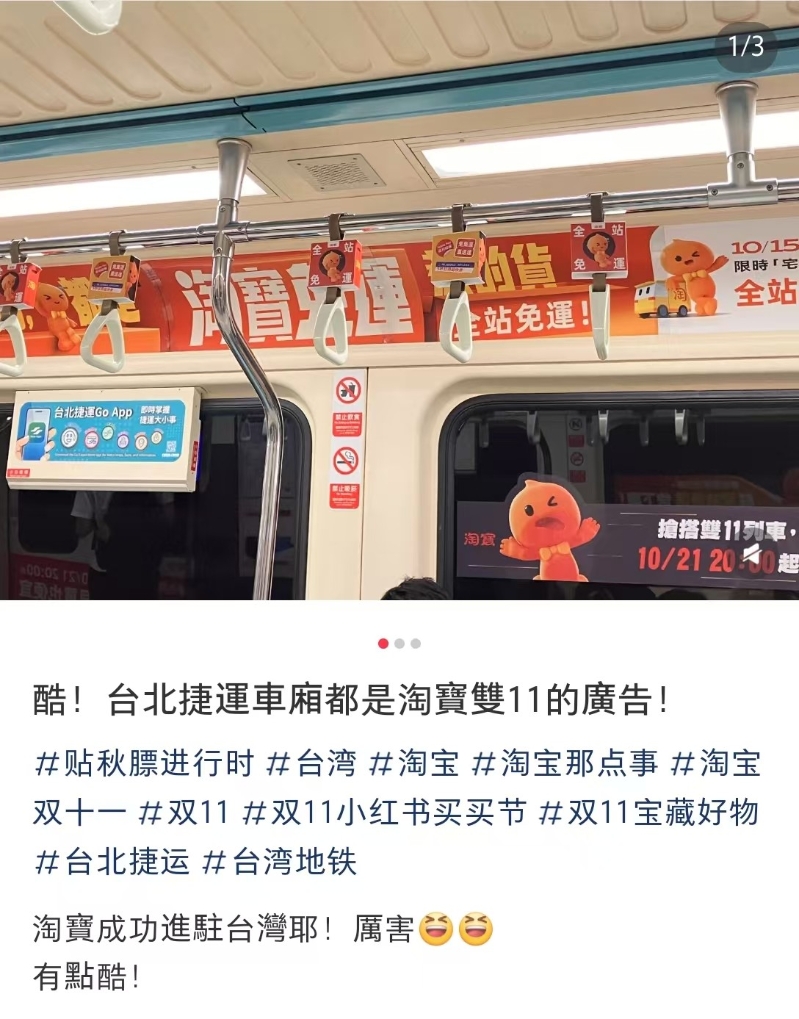 台灣網友在社交平台上分享在台北捷運上看到的淘寶“雙11”廣告。 一年一度的“雙11”購物節前夕,許多台灣網友就在台北捷運上看到了淘寶廣告,因為感覺新奇,還興奮地分享到社交平台上,并表示準備“剁手(大肆購物)”。