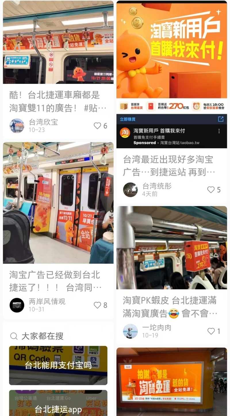 社交平台截圖 然而,台灣民進黨“立委”林楚茵、沈伯洋卻對此十分不滿,居然在今天(11月8日)與經民連召開記者會,指責淘寶以低價策略滲透台灣市場,還稱淘寶打廣告違反台灣相關規定,呼籲台灣當局相關部門對淘寶和台北捷運罰款。 很快,北捷公司對此做出回應,稱本案為“香港商淘寶國際產業有限公司”委託廣告代理商申請於捷運車站及車廂內上刊,相關程序均依法辦理,并經相關部門審議通過同意刊登。 淘寶當天也發出聲明表示,致力於遵守適用的台灣法律規範,并努力保障用戶權益和提升購物體驗。 淘寶指出,在台營運模式為跨境電商平台,台灣消費者透過淘寶提供的境外電商服務完成海外商品採購,本地履約服務商也在遵從適用法規的情況下提供履約服務,相關履約流程與信息安全保障,皆取得用戶同意并符合國際標準要求。 淘寶說明,為進一步提升台灣消費者跨境購物體驗,2018年經台灣主管機關核准,成立在台合法運營的陸資公司“香港商淘寶國際產業有限公司台灣分公司”,得在台進行品牌營銷推廣業務,且每年皆向主管機關進行業務匯總報告,并配合各項指導要求。 “綠委”對淘寶廣告如臨大敵的反應,讓台灣網友感到無語,喊話民進黨“不要阻擋我買淘寶”。