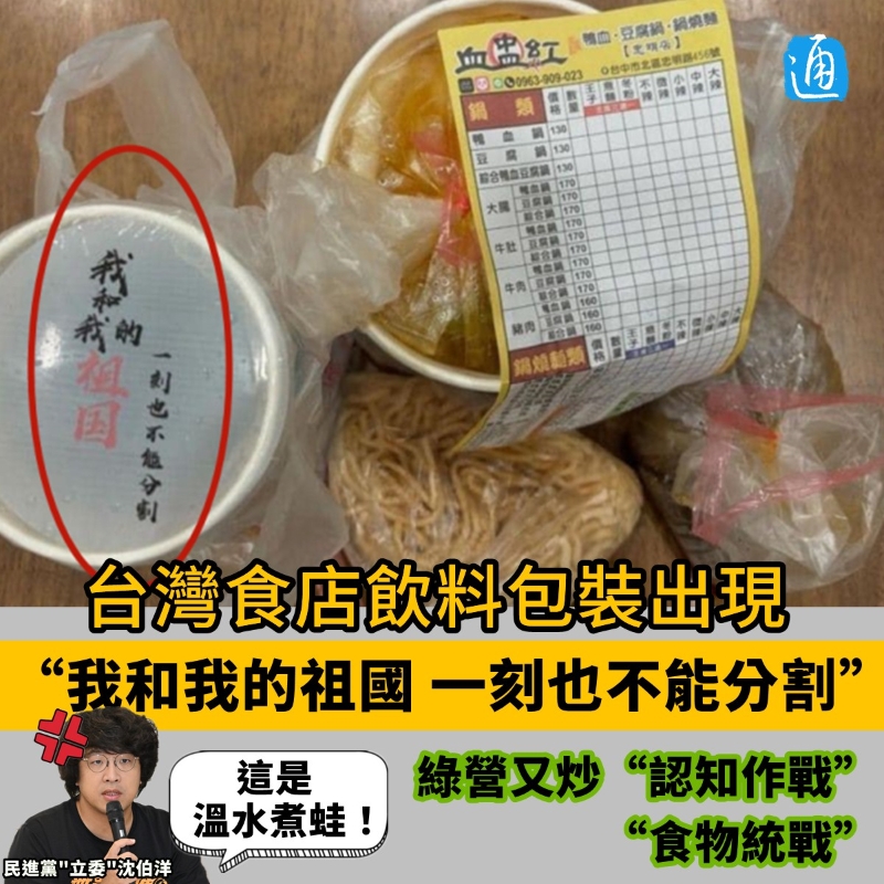 香港新聞網製圖 綜合台媒報道,一家位於台中市、名為“血盅紅”的麻辣鍋店近日被食客發現,其飲料杯封口膜上印有“我和我的祖國一刻也不能分割”字樣。這句話出自大陸一首膾炙人口、表達對祖國深沉之愛的抒情歌曲——《我和我的祖國》。該店隨後被指責“往食物滲透政治傾向”,并因此在網絡上遭遇口誅筆伐。 在事件不斷發酵之際,店家創始人在社交媒體上回應道,封口膜印的那句話并非自己的“立場和本意”,承諾今後不再使用這款封口膜。創始人表示,店裡此前為了節省成本,沒有自行開版製作封口膜,而是從大陸電商平台淘寶進貨。 早在今年8月,就發生過類似的事件。同樣因為使用了印有“我和我的祖國一刻也不能分割”字樣的封口膜,台灣雲林縣一家飲料店當時被推到風口浪尖上。 對於此次事件,有台灣網民認為封口膜是店家“政治立場的表態”;也有人表示“不必較真”,因為店家只是出於成本考量。 一些親綠媒體不忘在此次事件上藉題發揮,炒作所謂的“食物統戰”。時常將“認知作戰”掛在嘴邊的民進黨“立委”沈伯洋也跳出來,宣稱這是“民間滲透”和“溫水煮青蛙”。 綠營類似的炒作已非新鮮事。就在去年,大陸一款在台銷售、備受台灣民眾喜愛的螺螄粉,其外包裝上的土味情話“你是中國人,我也是中國人,四捨五入一下,你就是我的人”被綠營解讀為“統戰”并大肆炒作。這款螺螄粉最終被民進黨當局“下架”。當時就有台灣網民批評民進黨當局:“萊豬、核食都不怕,(竟)會怕幾個字。”(完) 【編輯:李雪萍】