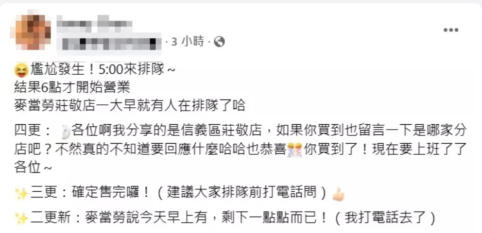 (圖源:臉書社團“信義區兩三事”) 然而,麥當勞各分店的銷售情況各有不同。有網友分享,他排隊約20分鐘便順利購得兩個堡,而有些人則排了半小時後也成功買到。(完) 【編輯:黃璇】