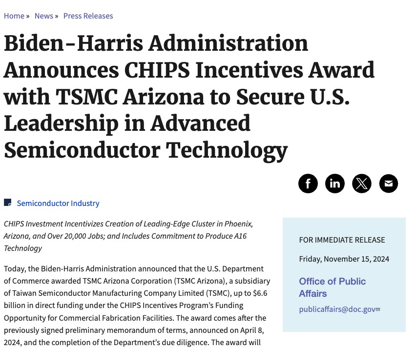 美國補助台積電66億美元。(圖源:美國商務部) 這不,美國商務部在11月15日宣佈,將根據《芯片法》向台積電亞利桑那州廠提供66億美元的資金補助,並特別點名台積電的先進技術。據台灣“中央社”報道,美國商務部在新聞稿中稱,台積電承諾將在美國生產最新的A16製程。 台積電董事長魏哲家稱,這有助台積電“加速”在美發展最先進的半導體製造技術。 A16是台積電今年4月剛發表的先進技術。根據台積電官網資料,A16製程是下一代奈米片技術,採用超級電軌方案,預計2026年下半年量產。一般認為,台積電A16製程為2奈米後的下個關鍵技術節點,有台媒形容“又一關鍵技術將複製到美國廠”。 針對外界關注先進製程可能赴美一事,台積電董事劉鏡清也在台灣立法機構做出了回應,坦言“這不是樂觀其成的問題,而是政治因素”,稱雖然美國成本比較高,但若買方能夠接受、願意下單,台積電有能力製造,就會出貨。 台灣資深媒體人陳鳳馨在網絡節目《東南西北龍鳳配》指出,台積電頻繁在海外設廠,但大多是成熟製程。許多人認為依照台灣法令,最新製程都不得離開台灣,需待最新製程在台發展成熟後,前一代技術才可在海外落腳,但她直言,特朗普明年上任後,台積電對美投資步調可能加快,屆時台灣政治恐無法保住台積電的最新製程。 台灣前“立委”郭正亮表示,美國直接利用補助跟台積電開條件,台灣經濟部門完全聽命於美國政府,“真是台灣的一大悲哀”。 特朗普在美國大選期間,曾多次指責台灣搶走美國芯片生意,應向美國支付“保護費”,並批評拜登政府的《芯片法》“太糟糕”。特朗普認為,與其花錢補貼海外業者赴美設廠,不如直接對其出口產品加徵高關稅,這樣就能迫使他們在美國“自費設廠”。 按照計劃,台積電將在美國亞利桑那州設立3座晶圓廠,第一廠量產4奈米製程,預計在2025年上半年量產;第二廠將採用2奈米或3奈米製程技術,支持AI需求,預計2028年開始生產;第三廠將採用2奈米或更先進的製程技術。(完) 【編輯:石歡歡】