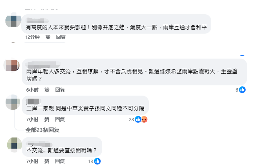 網友評論 “有高度的人本來就要歡迎!” 還有網友暗諷台灣綠營“別像井底之蛙、氣度大一點”。 有網友表示,兩岸同胞同屬中華民族、炎黃子孫,同文同種不可分隔,“兩岸年輕人多交流,互相了解,才不會兵戎相見” 。