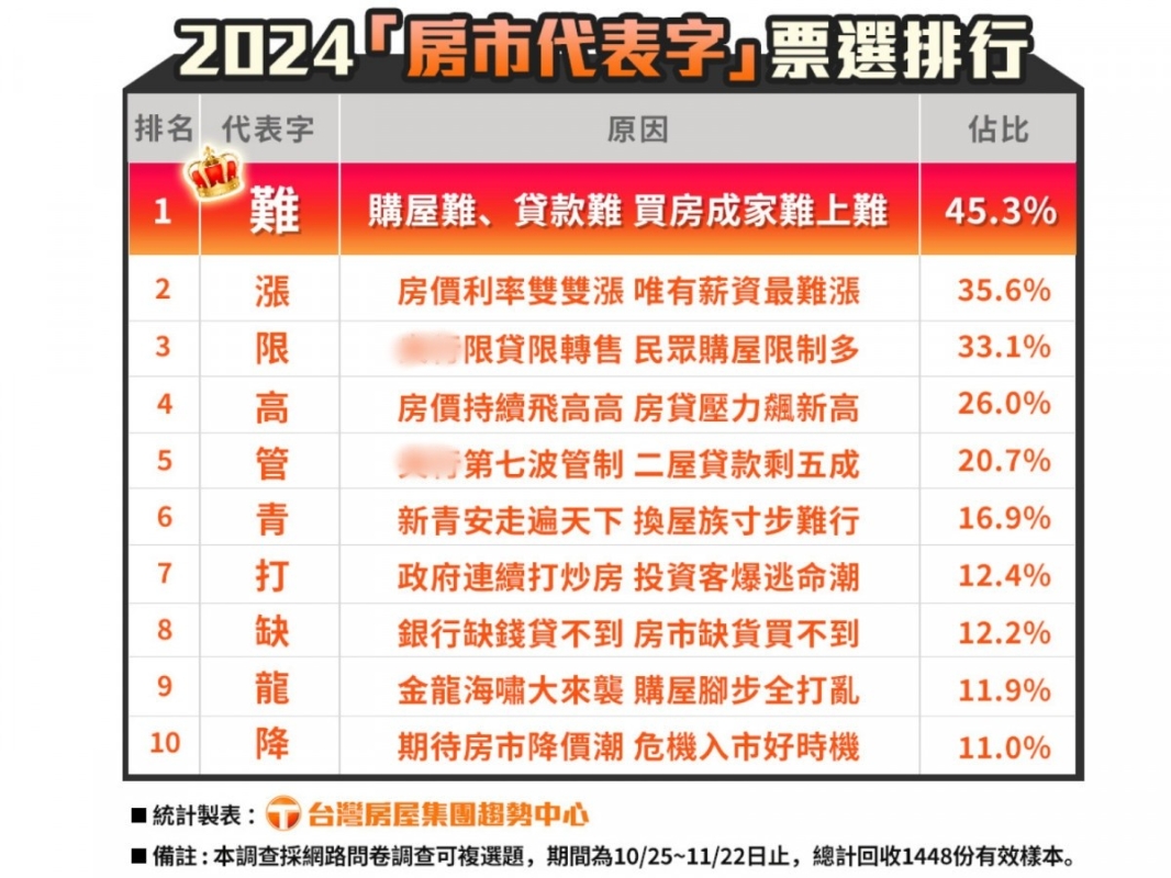2024年台灣房市代表字揭曉“難”字奪魁。圖源:台灣房屋集團趨勢中心 台灣房屋集團趨勢中心表示,台“央行”今年第三季宣布第七波房市管制措施,管制範圍從“六都”擴大至全台,貸款門檻提高,房屋估價金額保守,審核時程延長。換房族舉步維艱,房市由熱轉冷,氣氛急轉直下。 據介紹,台灣房市年度代表字評選活動,今年已邁入第16年。觀察近三年台灣房市年度代表字,2022年為“升”,全球進入升息循環,台“央行”為抑制通脹,全年四度“升”息。2023年台灣房價、物價、利率全面上漲,“漲”字第二度成為年度代表字。 來到2024年,通脹持續升溫,全台房價持續上漲。“央行”雖未再進一步升息,但信用管制政策限縮房貸條件,讓買房一族更“難”成家。(完) 【編輯:淩玉輝】