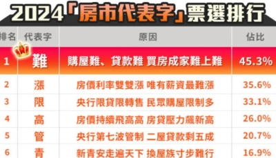 2024年台灣房市代表字揭曉 “難”字奪魁分享到: