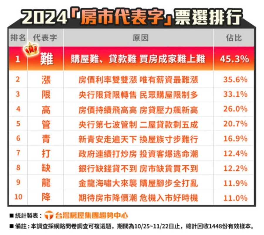 “難”字獲選台灣2024年房市代表字。(圖源:台灣房屋集團趨勢中心) 展望台灣2025年房市,該中心研判,受房貸政策牽制,銷售產品將以面積較小、價格較低的住房為主,買方則多為有自住需求的人群。 據悉,台灣房屋集團自2009年起,每年舉辦房市代表字評選,“凍”“等”“憂”“苦” 等字曾獲選。(完) 【編輯:黃璇】