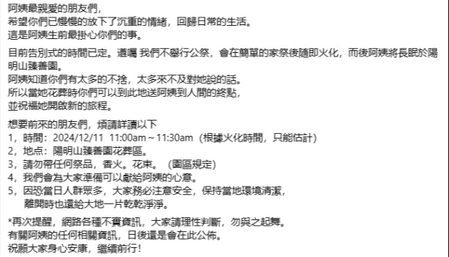 (圖源:瓊瑤FB) 當日,《還珠格格》女主角林心如低調參加告別儀式。據報道,現場還傳出該劇片頭曲《當》,用動力火車的歌聲送瓊瑤最後一程。 俞小凡及台灣歌手李翊君亦現身瓊瑤花葬儀式。俞小凡表示:“想來送瓊瑤姐最後一程,她是心思細膩的人,一直追求完美,寫了那麼多愛情故事,她深深體會愛情的浪漫,此時此刻幻化成美麗蝴蝶,飛到平先生身邊繼續她最愛的寫作。”她透露35年前與瓊瑤合作,對她的照顧點滴在心。 中國國台辦亦對瓊瑤去世表示哀悼。國台辦發言人朱鳳蓮稱,瓊瑤女士是一位具有重要影響力的台灣作家,對祖國大陸充滿深厚的感情,為推動兩岸交流和影視合作發揮了積極的作用,我們對瓊瑤女士辭世表示深切哀悼,向其家屬致以誠摯慰問。 瓊瑤本名陳喆,出生於四川成都,祖籍湖南衡陽。1949年,瓊瑤隨父母由大陸到台灣生活,中學時開始寫作,16歲時以“心如”為筆名發表小說《雲影》,25歲出版首部長篇小說《窗外》,從此成名。 瓊瑤一生創作逾60部小說,幾乎都被改編成影視作品。其中較為知名的包括《庭院深深》《幾度夕陽紅》《煙雨濛濛》《一簾幽夢》《窗外》《彩雲飛》《梅花三弄》系列及《還珠格格》三部曲等等。(完) 【編輯:劉春】