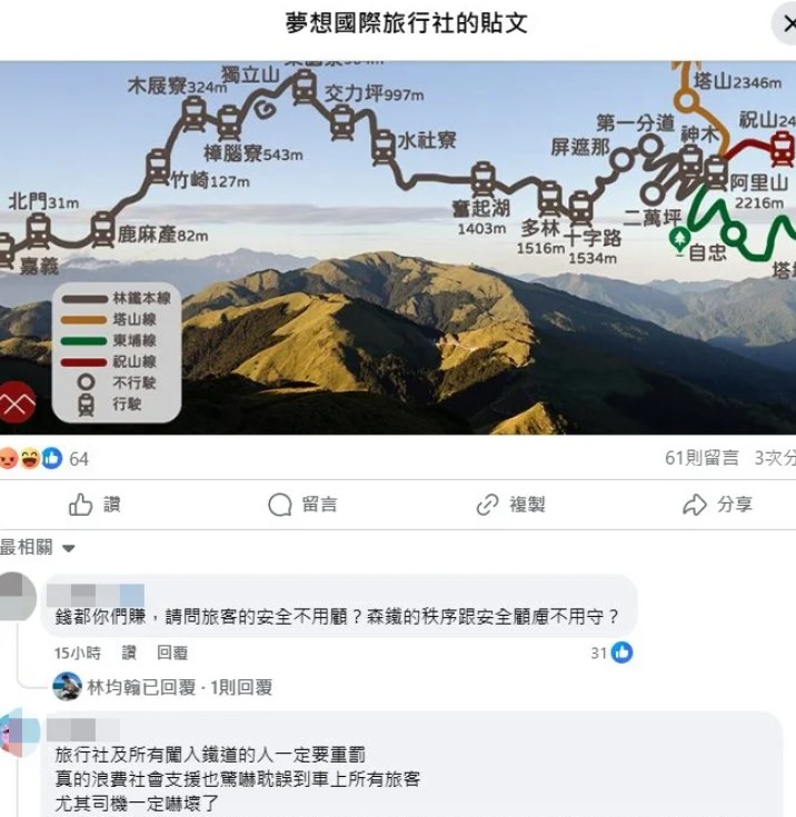 香港新聞網12月16日電 本月14日,台灣阿里山鐵道發生一起遊客違規闖入鐵軌區並遭火車撞擊的事故,造成一名遊客受傷。涉事的“夢想國際旅行社”因曾有類似前科而受到廣泛關注,網友紛紛在其官網留言譴責,質疑其對遊客安全的漠視。 此次事件引發了公眾的強烈反響,許多網友在夢想國際旅行社的社交媒體平台留言,批評該旅行社“只顧賺錢,不顧遊客安全”,並呼籲有關部門對其進行重罰。一位網友質疑道:“夢想國際旅行社幫您達成被火車撞的夢想。”