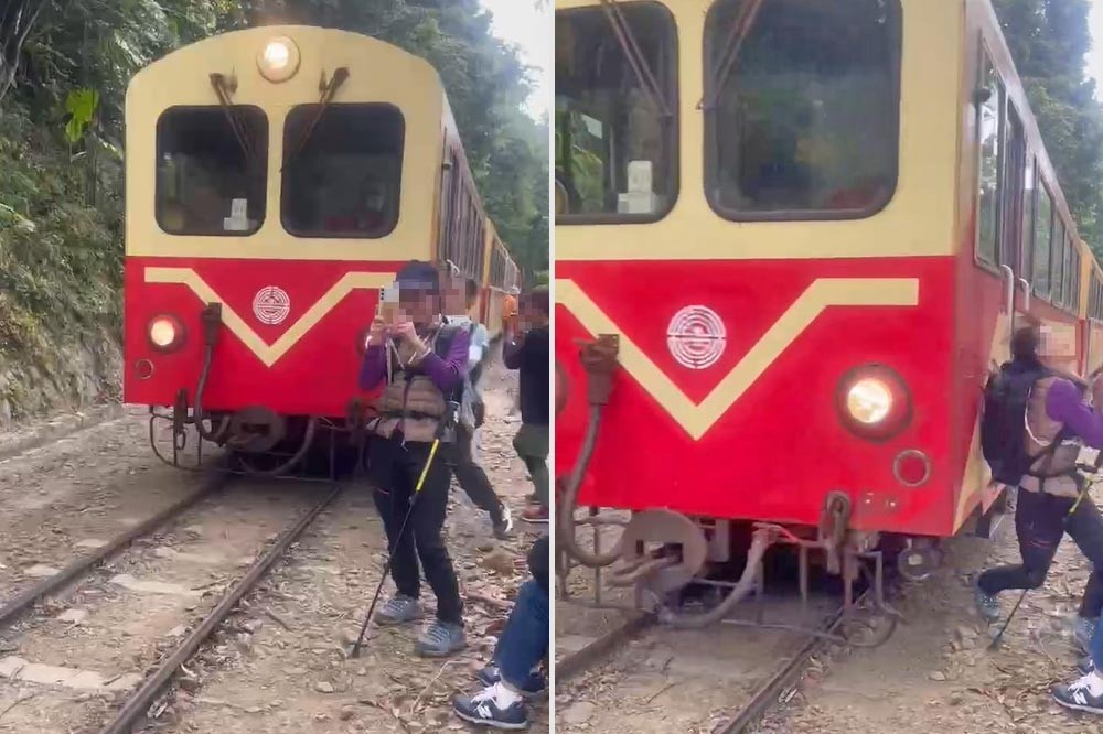 女遊客闖入鐵軌區拍照,遭阿里山森林鐵路火車擦撞受傷。(視頻截圖)