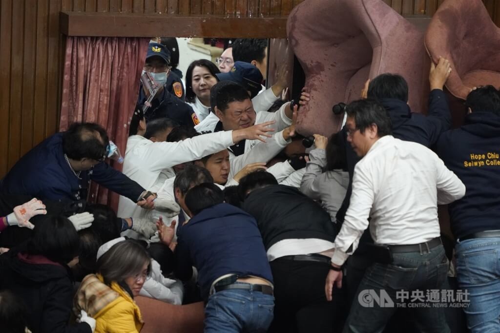 香港新聞網12月20日電 台立法機構原定今天(20日)處理“選罷法”、“憲訴法”及“財劃法”修正草案等案,藍委早在17日開始於議場扎營守夜,不料昨晚(19日)民進黨團發動突襲,直接破窗闖進議場後佔領主席台,隨後還將門反鎖。今天上午9時後,中國國民黨“立委”兵分三路,突破封鎖進入議場,與民進黨“立委”發生激烈的肢體衝突。