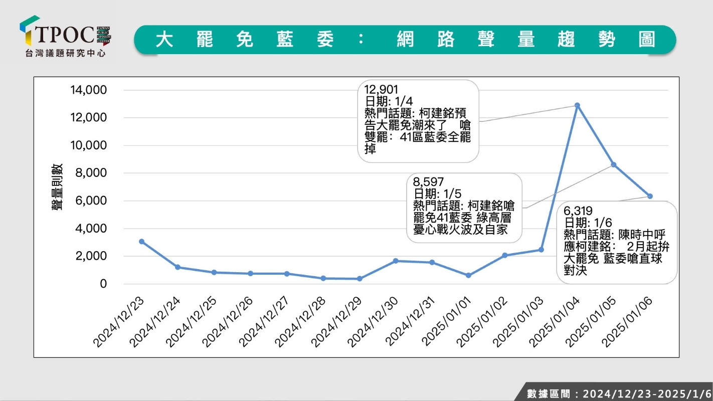 “大罷免”引發藍綠亂鬥!台灣普通民眾關心嗎?答案來了香港新聞網1月9日電 日前,民進黨立法機構黨團總召柯建銘喊出“雙罷”,要罷免台立法機構負責人韓國瑜及41席國民黨區域“立委”。中國國民黨主席朱立倫8日則表示,民進黨做好全面戰鬥準備,國民黨也會全面備戰。台輿論擔憂大罷免潮將來臨,“TPOC台灣議題研究中心”透過“QuickseeK快析輿情資料庫”,蒐集近期與罷免相關的網路聲量數據,結果顯示,柯建銘提出“大罷免說”後沒幾天,關於罷免的聲量已呈下降趨勢。