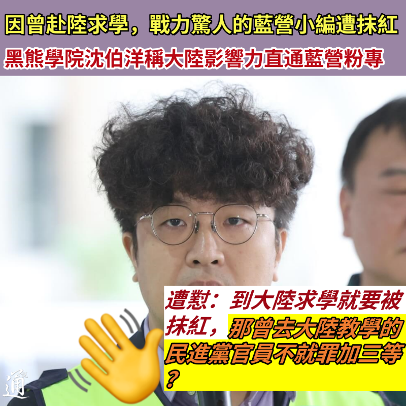 就因曾赴陸求學,戰鬥力驚人的國民黨小編遭抹紅香港新聞網1月16日電 台灣“黑熊學院”被爆收“內政部”補助,國民黨社交平台臉書小編在與“黑熊學院”創辦人、民進黨“立委”沈伯洋“交戰”過程中身份曝光,被起底曾在大陸念書。對此,沈伯洋之流仿若“撿到寶”,聲稱大陸影響力直通國民黨粉專,意在抹紅國民黨。藍委及前“立委”等則紛紛發聲回懟,指若按沈伯洋邏輯,到大陸求學就要被抹紅,那曾去大陸教學的民進黨官員不就罪加三等?