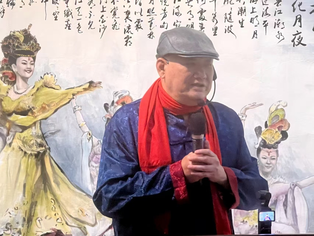 台灣中華詩詞藝術協會理事長謝明輝致辭。 (謝明輝提供) 新北市文化局副局長于玟致詞表示,新北市政府一直致力於中華書晝藝術的推廣與發展,也給市民提供了難得的詩詞書畫欣賞的機會。新北市議員林國春強調了文化交流在兩岸關係中的重要作用,希望通過這樣的活動,增進兩岸同胞的相互瞭解與情感認同。 中華文化總會前秘書長蘇進強,中國文藝協會理事長王吉隆,中國美術協會理事長李沃源,天津市台資企業協會創會會長張連興等多位貴賓先後致辭。他們對展覽的中華詩詞及書畫結合意義給予高度評價,對參展藝術家的熱烈参與表示衷心感謝,並期待未來能有更多這樣的文化交流活動,推動中華文化走向世界。 開幕式的另一亮點是現場揮毫。藝術家們紛紛大展身手,筆走龍蛇、墨韻飄香。其中,“春江花月夜 - 全球慶元宵”由眾人共同揮毫,完成一幅蘊含節日氛圍與文化內涵的書法作品,寓意著全球華人在中華文化的紐帶下,團結一心,共慶佳節。