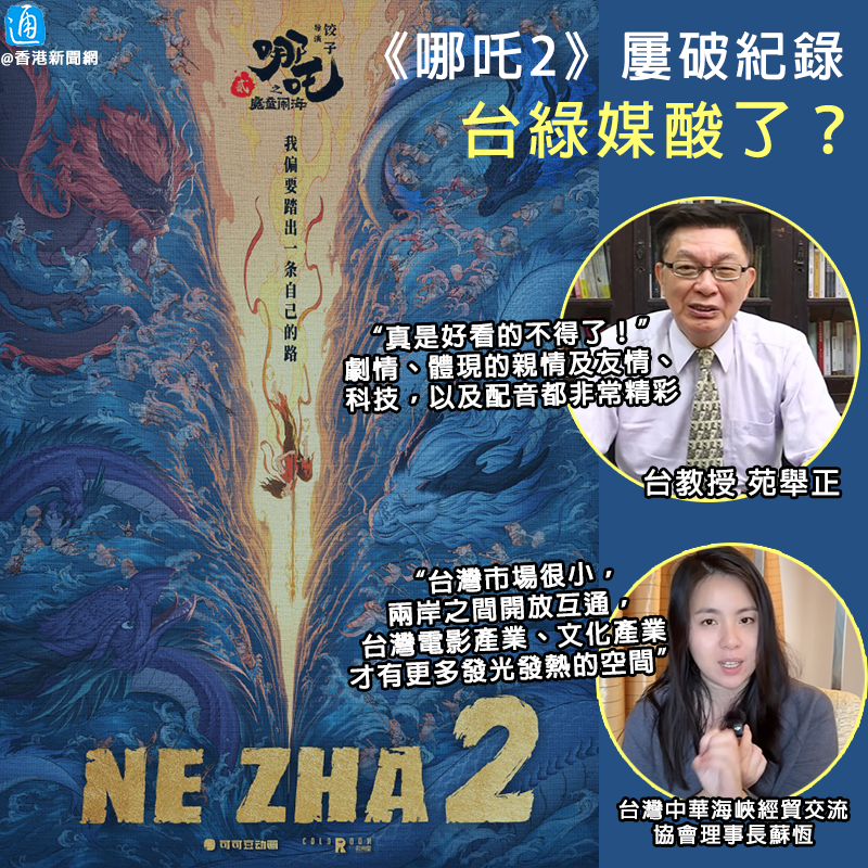 香港新聞網製圖 去年大陸遊戲《黑神話:悟空》讓台灣人重新認識到大陸的動畫實力,因此民進黨更會嚴格對文化管控,不會輕易讓《哪吒2》來台上映。但蘇恆指出,這對台灣來講非常不利,因為台動畫產業、文化產業無法向更厲害的對象學習。 蘇恆直言台灣市場很小,呼籲兩岸之間開放互通,台灣電影產業、文化產業才有更多發光發熱的空間。 【編輯:李冉】