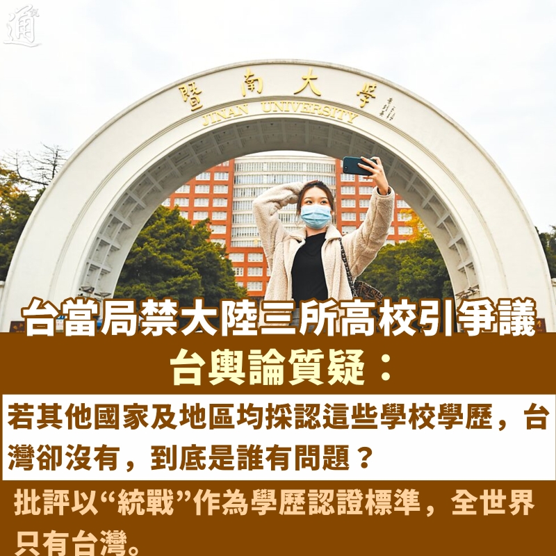 民眾黨團副總召張啓楷也提醒說,除非民進黨要與大陸學校全面斷掉交流,不然請注意兩件事,一是要保障學生權益,二是不要成為世界笑柄。 “台灣的年輕人去大陸唸書,不會被大陸‘洗腦’,卻會看穿民進黨的‘洗腦’!”台北市議員侯漢廷直言,這些台青去到大陸,會發現“大陸高鐵原來是有靠背的”“大陸不是窮得只能吃榨菜”,民進黨講的很多東西都是騙人的! 一名在大陸大學取得博士學位,目前在大陸南方某大學任教的台籍教師指出,台生在陸求學,很多是因父母在大陸工作,子女被斷掉回家鄉工作的權益,台當局在做此決策時,是否有考慮他們的合法權益? 有在讀學生表示,若是因台當局不採認學歷影響就職,會考慮留在大陸或去其它地方發展。 面對諸多質疑,台陸委會主委邱垂正今日(21日)聲稱,尊重“教育部”的決定,還堅稱剔除暨南大學,仍有154所大陸學校,足夠台生選擇。 英國高等教育中心(QS)公布的2025年世界大學排名,暨南大學位列580名,台灣僅8所大學贏過它,如果將它放在台灣,足以名列頂尖大學之列。有民眾表示,大陸很多頂尖高校在國際排名上遠勝台灣的大學,民進黨用政治綁架學術,真是貽笑大方。 【編輯:李濼】