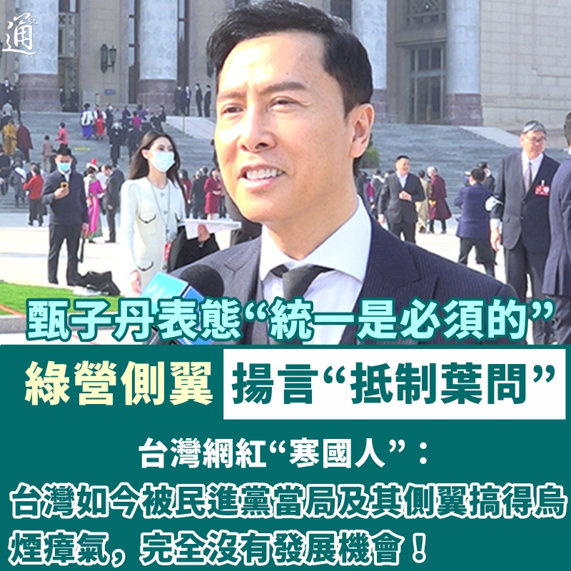 香港新聞網3月11日電 甄子丹表態“統一是必須的”,把綠營側翼整破防了? 全國政協十四屆三次會議3月10日在北京人民大會堂舉行閉幕會。作為港區全國政協委員的香港著名演員甄子丹出席會議。他在閉幕會前接受媒體訪問時,有台媒提問,“怎麼看待台灣當局要對台灣藝人表態‘中國台灣省’要開罰這件事?” 甄子丹強勢回應道,“你們這些人很壞,怎麼老問這些問題”,並批評台媒提問的出發點“不好,不正”。他同時強調“統一是必須的。” 甄子丹的霸氣回應立馬登上熱搜,大批網友力挺表示“我丹哥真霸氣”、“聰明,不上套”、“這還得是丹哥,直來直往!” 不過台灣部分綠營網友卻玻璃心碎一地,揚言“別讓甄子丹來台灣”,還說他這是“不得已而為之”,叫囂要下架甄子丹主演的影片《葉問》…… “我想問問綠營網友,你為什麼覺得甄子丹不得已?”台灣網紅“寒國人”針對此事反問道,“這難道不是甄子丹的心裡話嗎?” “今天台灣走到這一步,尤其是對美國予取予求,甚至完全‘跪下’,你以為這些表態的藝人看不懂嗎?”“寒國人”分析說,台灣如今被民進黨當局及其側翼搞得烏煙瘴氣,只知政治鬥爭,完全沒有發展機會。反觀大陸,AI大模型DeepSeek,國產3A遊戲《黑神話:悟空》,還有榮登全球票房第六的國產動畫巨製《哪吒2》,可謂多方面開花。 大陸反“台獨”意志堅定,民進黨當局口口聲聲要買武器“裝備自己”,“寒國人”進一步表示,武器也是美國生產的,還不是要看他臉色?如果真的是為了台灣民眾好,如今就該一致唾棄鼓吹“台獨”的人。 中國外交部長王毅7日在外交記者會上表示,台灣地區在聯合國的唯一稱謂就是“中國台灣省”。其後,“央視新聞”發布微博:“【一起轉發!這是台灣唯一的稱謂!中國台灣省】台灣從來不是一個國家,過去不是,今後更絕無可能。台灣唯一稱謂就是中國台灣省”。該條微博引發侯佩岑、歐陽娜娜、張韶涵、汪東城、趙又廷等至少20名台灣藝人轉發。
