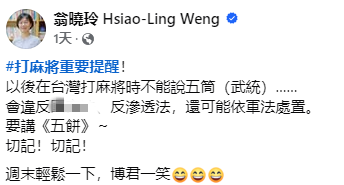香港新聞網3月17日電(編輯 胡雪石)近日,社交媒體“抖音”上的一名陸配博主,因“鼓吹‘武統’言論”遭到台當局調查,并被廢止在台依親居留許可,要求其在10日內離台,否則將面臨強製出境。對此,國民黨“立委”翁曉玲諷刺稱,以後在台灣打麻將時也不能說“五筒”(武統),否則可能依軍法處置。