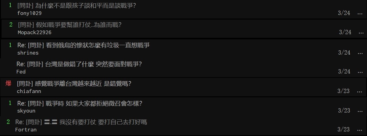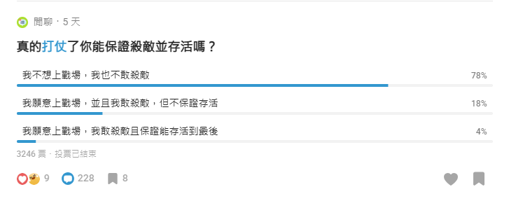 台灣網絡論壇PTT截圖 許多關於“戰爭”的小調查也“應時而生”:“真的打仗你會上戰場嗎?”“戰爭一旦爆發,想移民到哪裡去?”……在一眾小調查中,台灣最大匿名論壇之一的“Dcard”3月18日“真的打仗了你能保證‘殺敵’並存活嗎?”的調查結果顯示,在3246人裡面,78%選擇了“我不想上戰場,我也不敢‘殺敵’”。