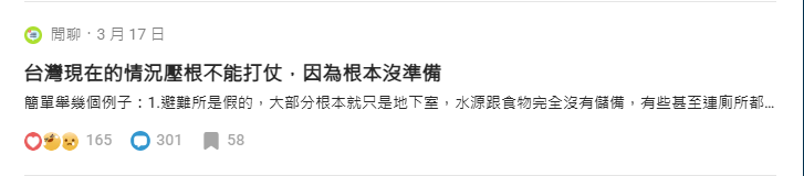 台灣社群平台Dcard截圖 “台灣與戰爭的距離”成了輿論焦點,越來越多人認識到“台灣沒做好備戰,也沒能力應戰”。前台北縣長周錫瑋甚至直言,台灣人民要和平、要繁榮,誰要自己的子女像烏克蘭一樣上戰場去死?為什麼民進黨一定要把台灣拖向戰場? 諷刺的是,凡事都要提“民意”的綠營,這會兒好像又聽不見民意厭戰、拒戰的聲音。被指“販賣”戰爭恐懼的“黑熊學院”甚至揚言,“和孩子談論戰爭,就是給予安全感。” (完) 【編輯:張依珊】