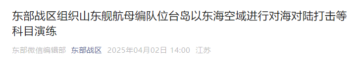 香港新聞網4月2日電 據微信公眾號“東部戰區”消息,中國人民解放軍東部戰區新聞發言人施毅陸軍大校表示,4月2日,中國人民解放軍東部戰區組織山東艦航母編隊位台島以東海空域,與海空兵力進行艦機協同、區域制空、對海對陸打擊等科目演練,重點檢驗內線外線一體聯動、立體封控和諸軍兵種聯合作戰能力。