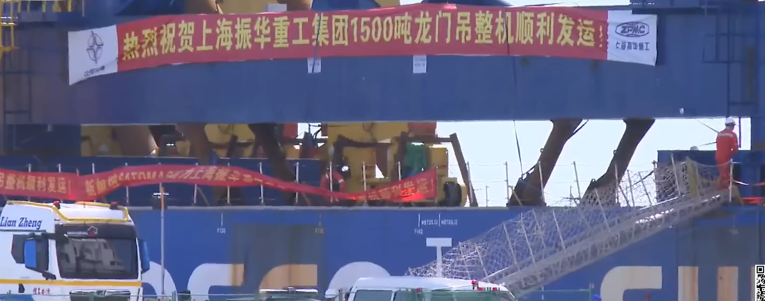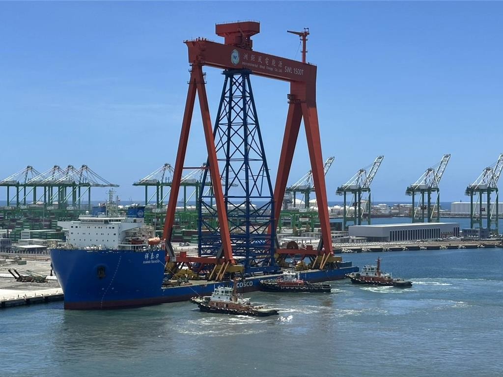 5月20日,洲鉅風電龍門吊車設施進高雄港。(圖源:台灣港務公司) 綜合台灣媒體昨日(5月20日)報道,為推動能源轉型,台灣港務公司規劃高雄港“洲際一期貨櫃中心A6場域”逾30公頃用地,由倉儲物流轉型離岸風電發展基地。 其中鄰近紅毛港基地由風電巨頭洲鉅得標,從去年下半年起開建。作為水下基礎組裝基地,除了室內組裝廠房和戶外組裝區,更搭配全台灣第一大1500噸軌道式龍門吊車設施。台媒預計,該龍門吊將成為吸引民眾目光的地標性大型設備。 據中時新聞網報道,該龍門吊是由大陸知名重型裝備製造商製造、組裝,并於福建港平潭港區完成整機裝船作業,5月14日自福建平潭啟運,20日上午從高雄港2港口進港。 據TVBS新聞網報道畫面顯示,該龍門吊相當宏偉,上頭還有“上海振華公司”的字樣,以及簡體字的紅布條。