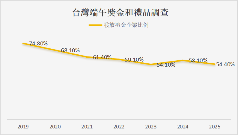 香港中通社資料圖片 台灣從今天(5月30日)起連放3天端午節假,許多企業會依照慣例發放端午節獎金或禮品。據台灣“yes123求職網”昨日發布的調查結果顯示,54.4%的企業今年會發放端午獎金,創下七年來次低水準。 這代表其餘45.6%的企業并不會給員工端午獎金。其中,16.3%不發獎金,但會發端午禮品;剩下的29.3%,既不發放端午獎金,也不發放端午禮品。 對比近7年來的數據發現,發放端午獎金或禮品的台灣企業比例逐年下滑,直到2024年回升,但在今年又再次下降:2019年為74.8%;2020年為68.1%;2021年為61.4%;2022年為59.1%;2023年為54.1%;2024年為58.1%。