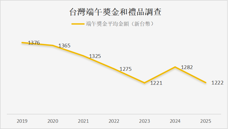 而今年會發放端午獎金的企業中,30%的企業預估會發“800元(新台幣,下同)至1200元不到”;26.9%的企業將發“超過500元至800元不到”;“500元(含)以下”占15.2%;“1200元以上至1500元不到”有7.9%。整體來說,台灣企業今年預計發放的端午獎金平均金額落在1222元。 對比近年數據,台灣企業發放的端午獎金平均金額也是除了2024年上漲以外,大體呈現下降趨勢:2019年為1376元;2020年為1365元;2021年為1325元;2022年為1275元;2023年為1221元;2024年為1282元。