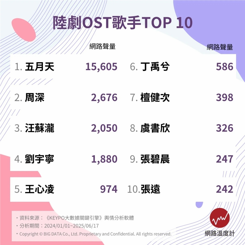 十大陸劇OST歌手榜單。圖源:台灣“網絡溫度計”網站 台灣“陸劇熱”不斷延燒,從2024年至今,古裝劇有《永夜星河》《墨雨雲間》,現代懸疑劇有《獵罪圖鑑2》,還有“爆紅全網”的《折腰》,“現象級劇集”《難哄》,霸榜台灣熱播排行榜的《藏海傳》……隨著這些陸劇的走紅,周深、汪蘇瀧、張遠、張碧晨等大陸歌手為更多台灣觀眾所熟識,並給台灣觀眾留下深刻印象。 6月23日,台灣網絡熱門話題分析網站“網絡溫度計”通過“KEYPO大數據關鍵引擎”輿情分析軟件,盤點近一年半以來(2024.01.01-2025.06.17)十大陸劇OST歌手。“網絡溫度計 DailyView”是全台最大數據分析平台,運用“KEYPO大數據關鍵引擎”網絡爬蟲技術取得巨量數據庫,涵蓋台灣大部分的網絡新聞頻道、社群平台、網絡論壇及部落格等網站資料。 張遠因演唱《錦繡安寧》的《雙》、《永夜星河》的《凝眸》等歌曲吸引了台灣觀眾的注意,排名第十。許多台灣網友表示,張遠的歌聲總能細膩描繪劇中人物的無奈與掙扎,令人忍不住動容。 張碧晨排名第九。她演唱了《難哄》的《晚點》、《淮水竹亭》的《如煙》等歌曲,多首歌一上線就霸佔音樂榜單。許多台灣網友誇讚張碧晨能將宏大場面的磅礴氣勢唱入歌中,也能細膩詮釋小兒女的情感糾葛;歌聲一出,便能迅速將聽眾拉入劇情氛圍。 汪蘇瀧排名第三。汪蘇瀧在陸劇OST界以“全能之姿”備受矚目,他的音樂風格廣泛,能輕鬆駕馭各種曲風;聲音溫柔細膩,創作的歌詞富有畫面感,總能精準地詮釋劇中角色錯綜複雜的愛恨情仇與悲歡離合。他為《難哄》製作並演唱的《像晴天像雨天》,成為台灣劇迷們瘋狂循環的熱門歌曲。截至2025年6月25日,這首歌在台灣音樂平台KKBOX的華語單曲週榜依然高居第七名。