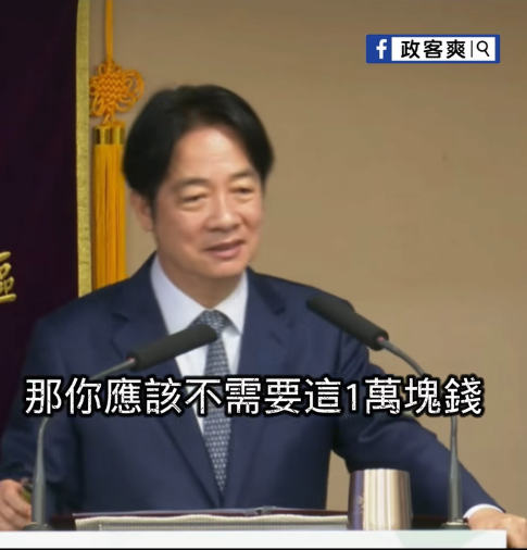 (截圖自政客爽FB視頻) 何不食肉糜的一番話,引發台灣輿論嘩然! 中國國民黨桃園市議員凌濤指出,賴清德問台下聽眾說“你應該不需要這一萬塊?”當下現場一陣安靜,因為那是民眾的納稅錢,還錢於民,為何不要?就連社會及經濟地位比較高的台北獅子會成員都面面相覷。 據悉,賴清德第四講的演講現場有不少是台北獅子會的會員,而獅子會成員大多為管理階層或老闆級的人物。 針對賴清德將全民普發1萬元與台電漲價相比較的言論, 島內資深媒體人黃揚明其後亦試算,普發1萬元,民生電價若調漲幅度與去年4月相同,對4口之家而言,普發的現金繳電費1年後,還有多少可用? 黃揚明在社交平台臉書指出,根據台電統計資料,台灣住宅用電從去年6月到今年5月的全年平均每戶電費為10673元,每月平均度數都在700度以下。而根據台電去年提供的試算表,每月用電量700度以下的4口之家,每天電費約增0.4元,因此一年可能增加電費為146元。 “4人普發現金共領4萬元,扣除10674再扣146元,還剩下29180元,還可以再繳至少2年半的電費。”黃揚明因而諷刺賴清德,“怎麼想,都是普發現金划算。” “另類版何不食肉糜?”臉書粉絲專頁“政客爽”則提到,賴清德第四講的演講現場都是台北獅子會的會員,他們大多為管理階層或老闆級的人物,“你跑去問這些人:‘你不需要普發一萬吧?’真的是很搞笑。” “台灣年輕人多的是大部分薪水都拿去付房租的狀況,不是每個都老闆或主管。”“政客爽”直批,賴清德不知道民間疾苦。 “政客爽”還指出,去年“超徵稅收”金額達5283億元,創史上新高,普發1萬不過是還錢於民,卻被賴清德拿來與被民進黨搞到千億負債、負債比已高達93%的台電類比,真的是太好笑。 “所以補台電1000億能撐多久不漲電價?”島內網友也紛紛炮轟賴清德之流“爽領高薪,就是不能苦民所苦。” “以前說台灣不缺電的是哪一個政黨?還信誓旦旦說經過縝密的計算。”還有網友指出,現在廢核後,“台電變成一個吃錢無底洞。主政者還好意思酸在野黨提案普發1萬元給人民。對啦!1萬元在民進黨這些人眼裡根本不算一回事。” 早前,賴清德出席一場活動,針對美國總統特朗普關稅戰造成的衝擊,亦脫口要台灣民眾“吃苦當吃補”,引發爭議。其後,台經濟部門負責人郭智輝還“幫腔”說,台灣人不都是吃苦當吃補?很正常,沒有天上掉下來的禮物。當時就遭島內網友群嘲,“但是你們都吃香喝辣的”,“不知民間疾苦”。(完) 【編輯:劉春】