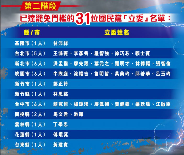 31名面臨罷免的國民黨立委名單 7月26日第一波罷免投票將決定24名國民黨立委去留,他們分別是:王鴻薇、李彥秀、羅智強、徐巧芯、賴士葆、洪孟楷、葉元之、張智倫、林德福、廖先翔、牛煦庭、塗權吉、魯明哲、萬美玲、呂玉玲、邱若華、廖偉翔、黃健豪、羅廷瑋、林沛祥、鄭正鈐、丁學忠、傅崐萁、黃建賓。 第二波投票則在8月23日舉行,決定7名國民黨立委命運,他們分別是:羅明才、林思銘、顏寬恒、楊瓊瓔、江啟臣、馬文君、游顥。 值得關注的是,這場罷免選舉可能使台立法機構的政黨版圖重新洗牌。 目前台立法機構共有113席立委,民進黨佔51席,也就是說,只要有6名藍營立委在罷免、補選過程中,被綠營立委取代,民進黨就能取得單獨過半,擺脫“朝小野大”格局,實現“完全執政”。